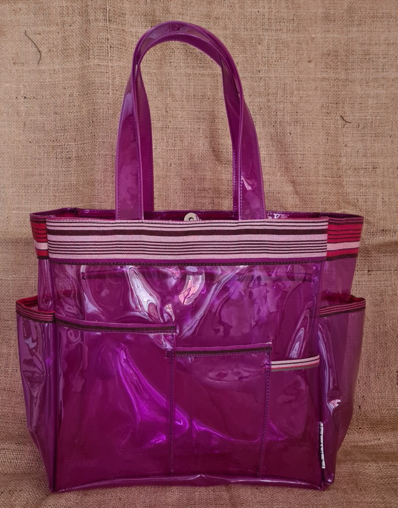 Made from PVC accented with handwoven fabric. Perfect everyday bag. Even has outside pockets to store some of your things. Easy to clean and disinfect.